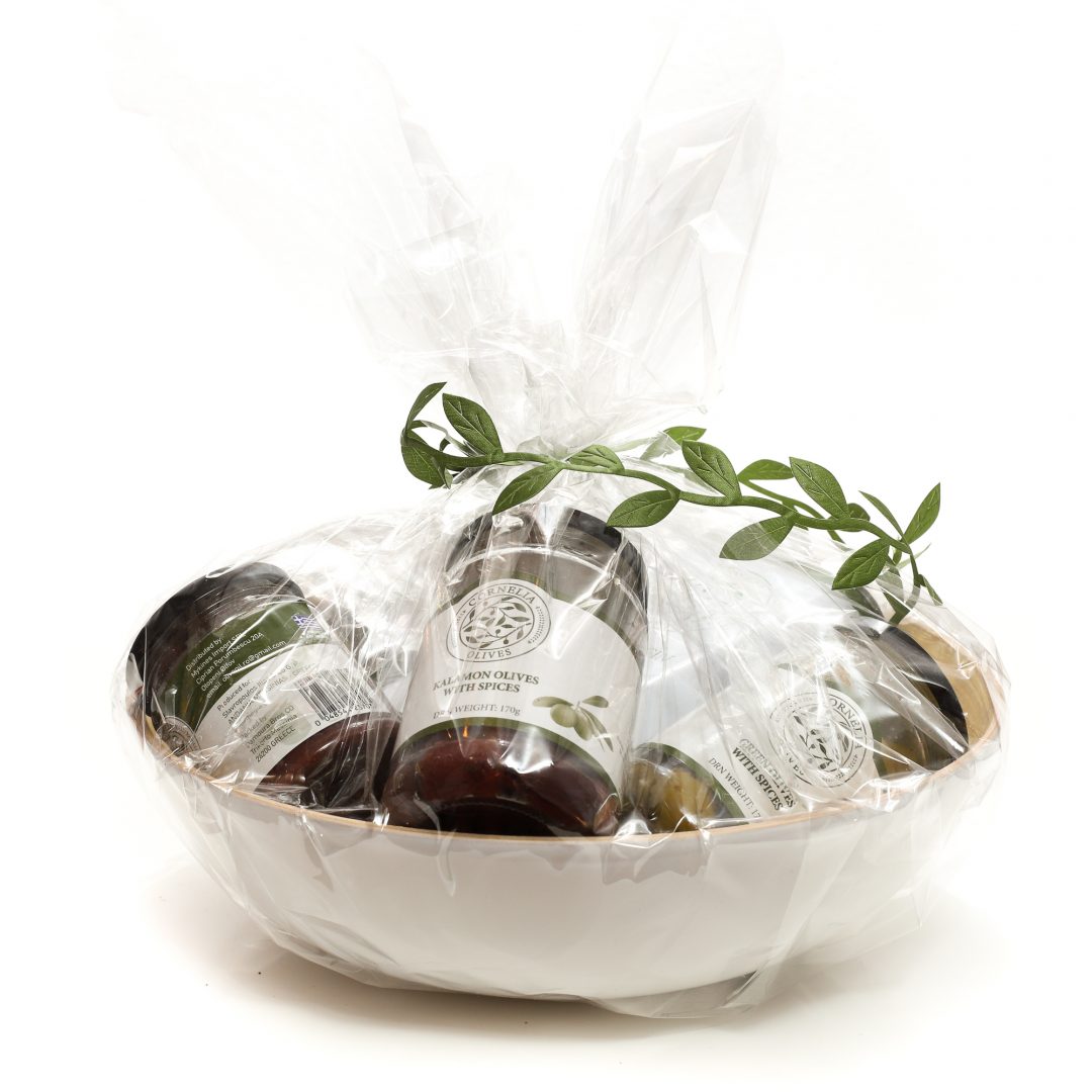 Coș bambus (alb) cu produse grecești, naturale și gustoase