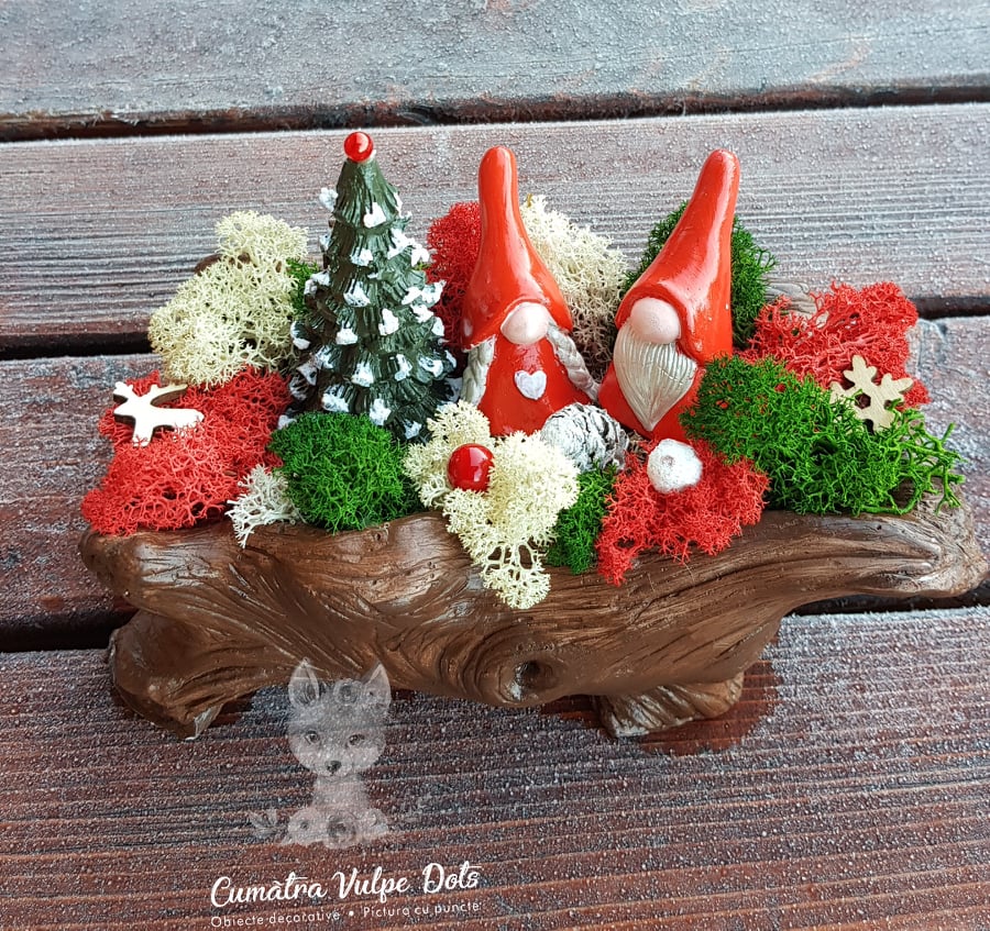 Decorațiune de Crăciun – doi gnomi cu brăduț în buturugă