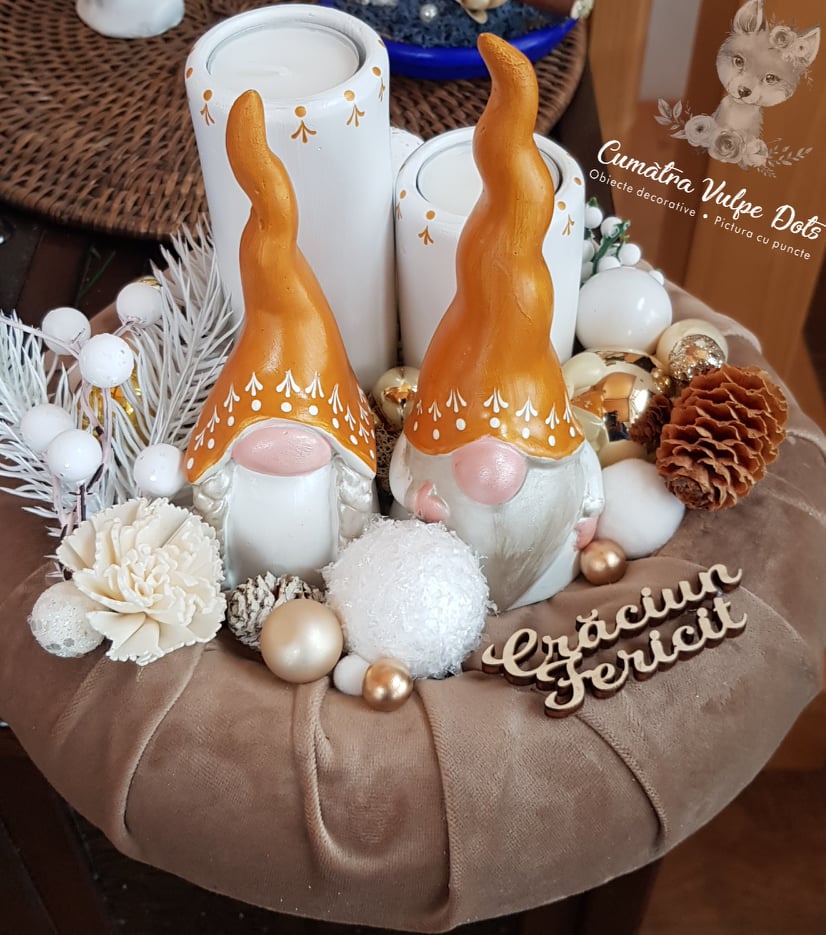 Decorațiune pentru masa de Crăciun – alb cu auriu, 2 gnomi mari