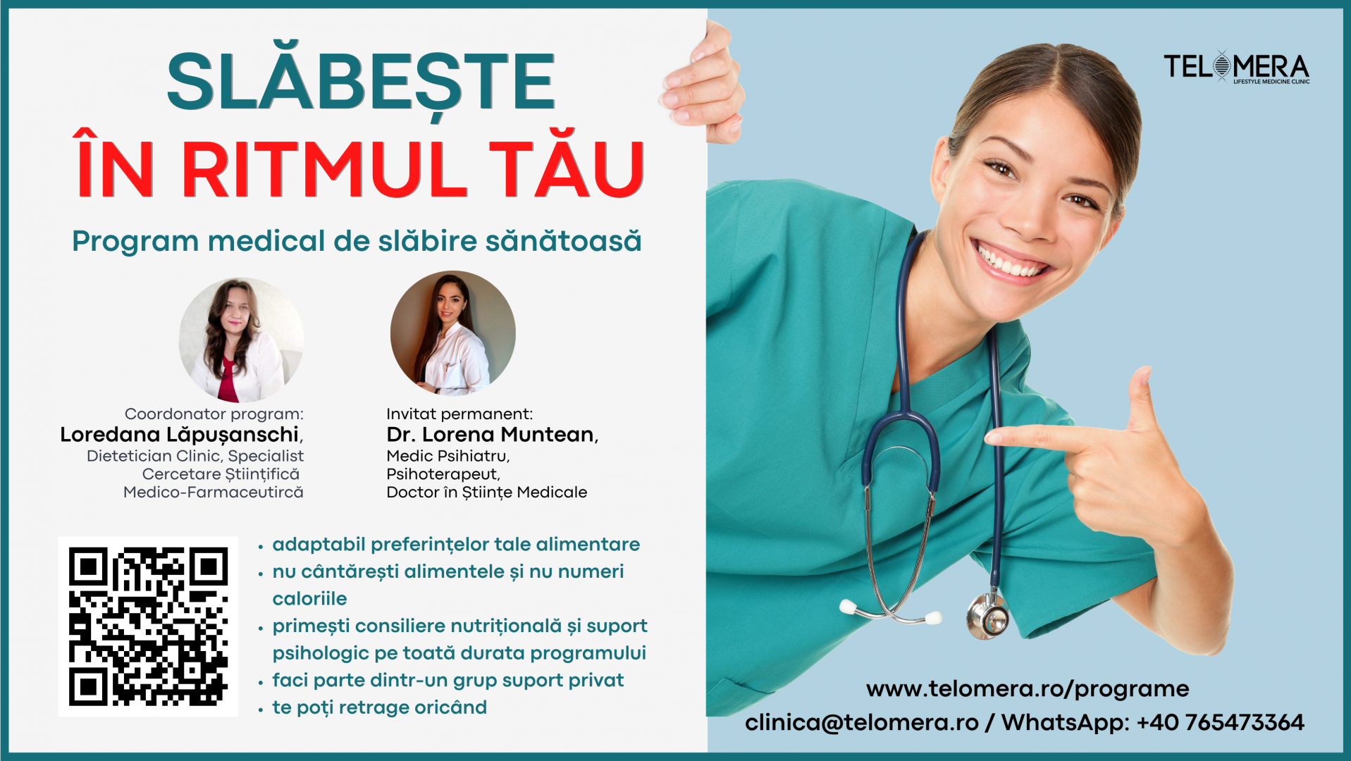 Program medical de slăbire sănătoasă, coordonat de Loredana Lăpușanschi, Dietetician Clinic autorizat de Colegiul Dieteticienilor din România, Specialist Cercetare Științifică Medico-Farmaceutică. Colaborator permanent: Dr. Lorena Muntean, Doctor în Științe Medicale, medic psihiatru, psihoterapeut.
