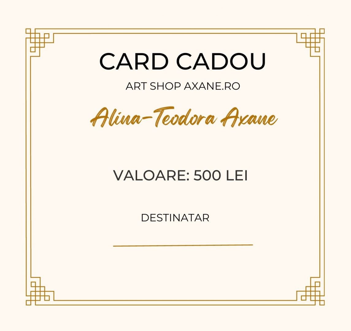 Cardul cadou este nominal, se poate utiliza ca reducere pentru cumpărături mai mari de 700 de lei din art shop, fiind valabil pentru toate categoriile de produse, timp de 12 luni din momentul emiterii, atât fizic, cât și online. Dacă doriți să-l printați, puteți solicita pe email sau telefonic fișierul pdf pentru print care să conțină numele persoanei căreia îi este destinat cardul.