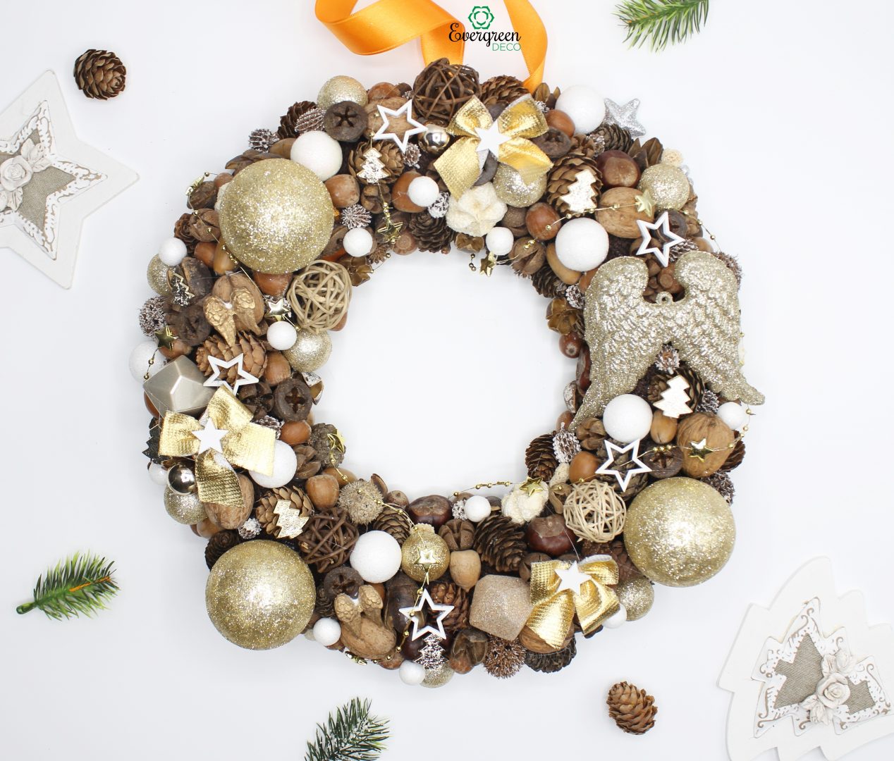 Coronita contine elemente din natura, globuri, figurine si alte accesorii.