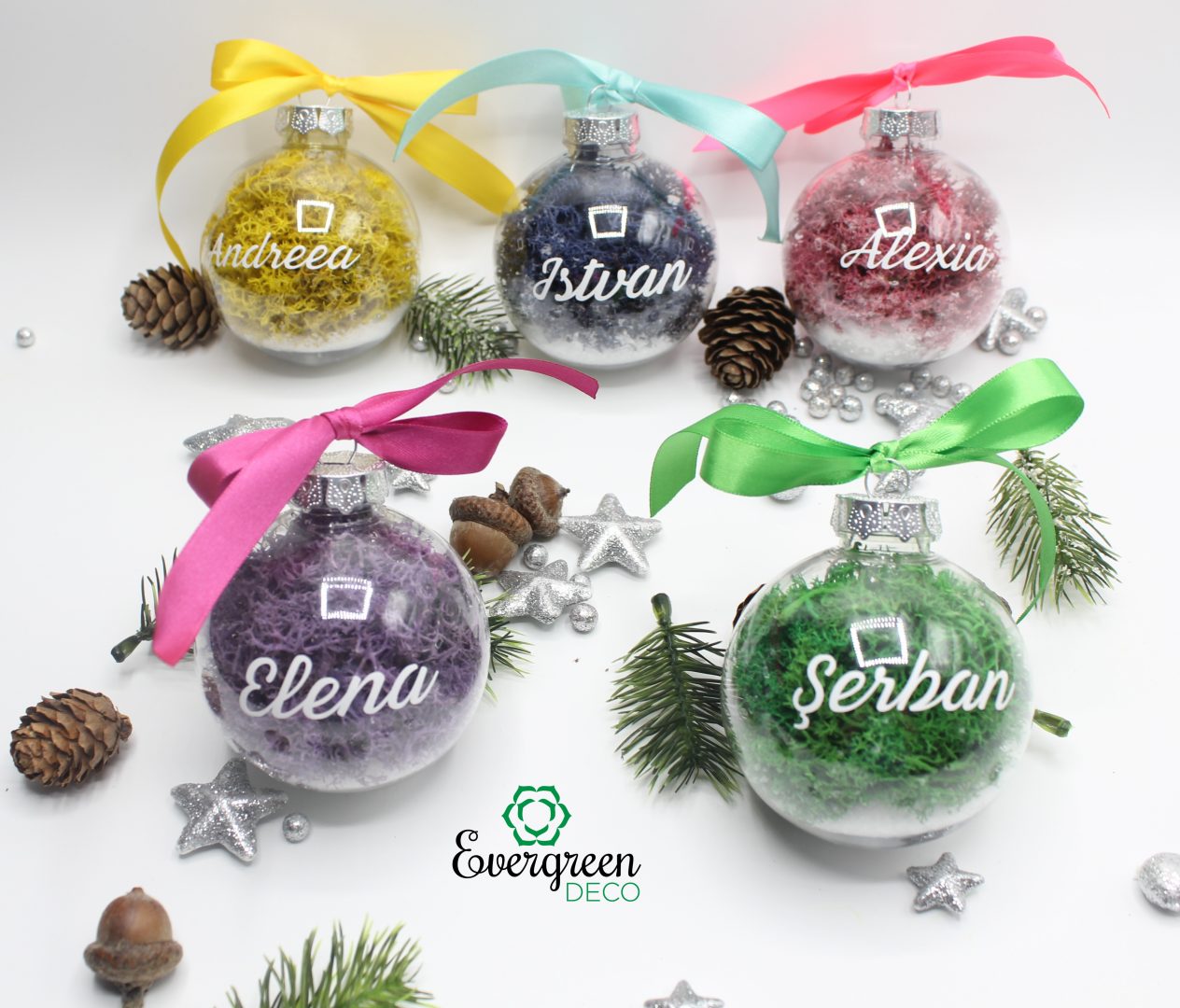 Globurile vii pe care le realizez cu licheni stabilizaţi sunt lucrate cu mult suflet şi creativitate, pentru a aduce în bradul tău un lucru unic, inedit şi personalizat.