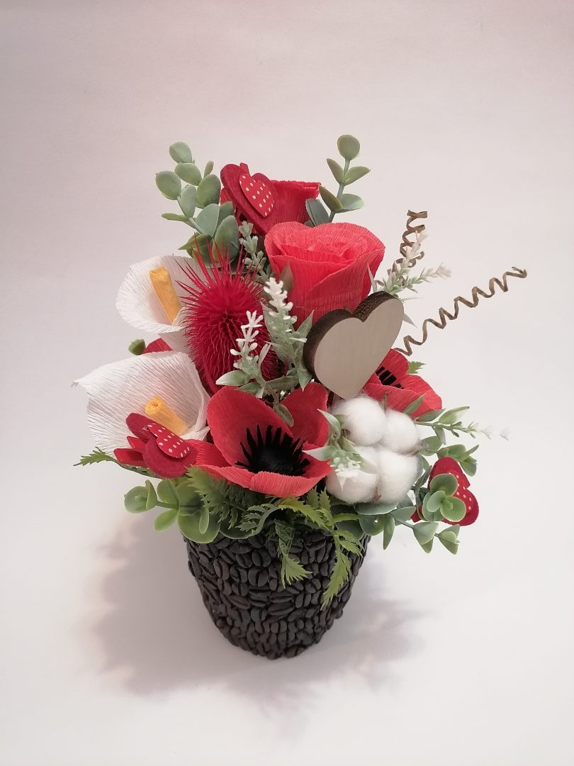Aranjamentul este realiat în cană decorată cu boabe de cafea. Am folosit flori din hârtie floristică, accesorii, floare de bumbac, verdeață. 🌼