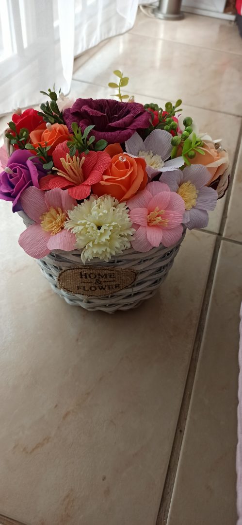 Aranjament floral realizat din flori de hârtie, lucrate manual si flori de săpun. Aranjamentele diferă în  funcție de preferințele fiecăruia și se pot personaliza. Pretul unui aranjament diferă de la model la model.