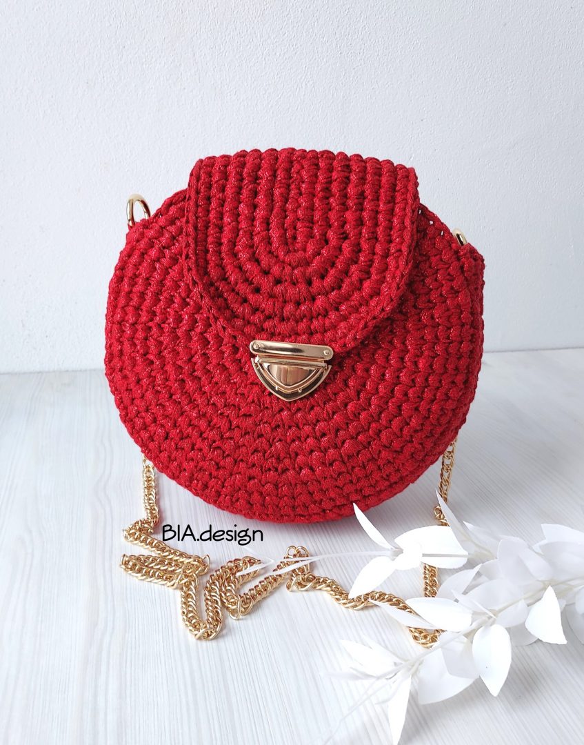 Geantă handmade, croșetată, diametrul de 25 cm, lățime de 12 cm. Este căptușită la interior, baretă de 120 cm cu inserție de fir. Se poate spăla manual sau automat, la program de delicate, la 30 de grade Celsius.