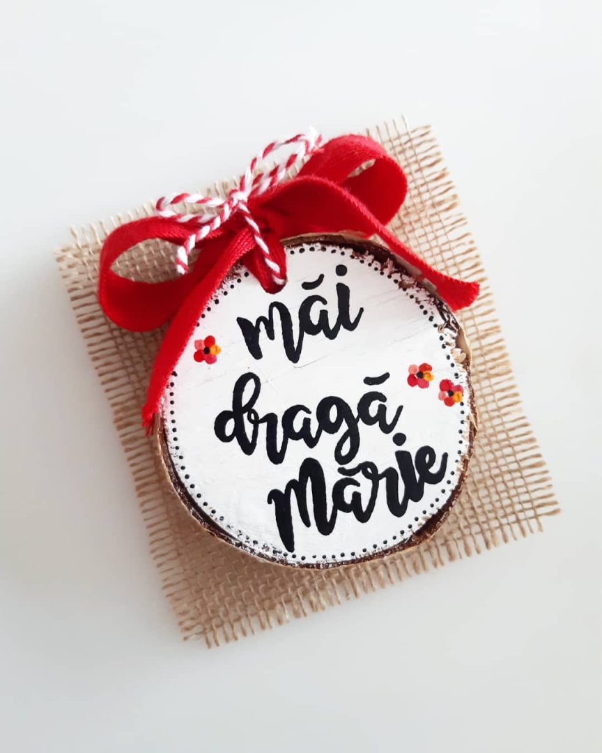Martisor pictat pe felie din lemn de mesteacan si personalizat cu mesajul tau de suflet in caligrafie moderna ornamentala si culori acrilice. De asemenea, finisat cu lac satinat tot pe baza de apa, pentru protectie si rezistenta in timp.