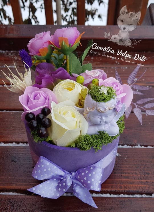 Aranjament delicat cu flori artificiale, dimensiune aproximativa, 15 cm latime.