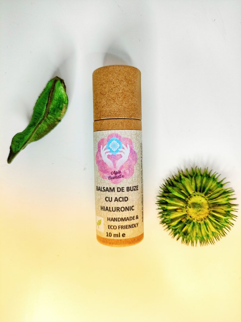 INGREDIENTE: Acid Hialuronic (Sodium Hyaluronate), Unt de Cacao (Theobroma Cacao Seed Butter), Ulei de Alune (Corylus Avellana Seed Oil), Ulei de Ricin (Ricinus Communis Seed Oil), Ceară de Albine (Cera Alba), Vitamina E (Tocopherol).