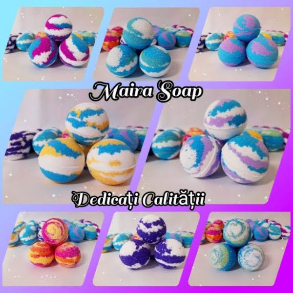 Bile de baie efervescente realizate cu ulei de samburi de caise , parfumuri deosebite si uleiuri esentiale .