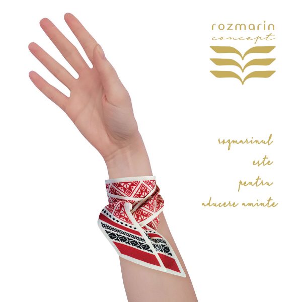 Eșarfa de mătase naturală STELUŢE ROŞII alătură culorile mărțișorului: alb (= curățenie) şi roşu (= viață, iubire) cu negrul (= pământ, stabilitate) și dă astfel glas urării de a trăi fericiți și îndrăgostiți până la adânci bătrâneți.