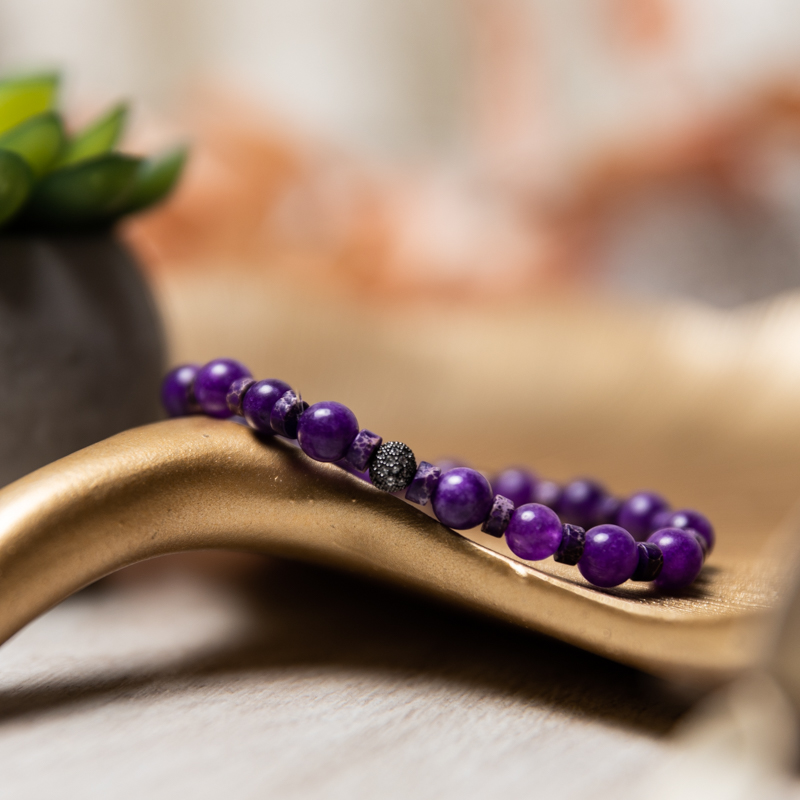 Chameli este o bratara delicata, eleganta, cu margele de 6mm. Piatra de Jad Mov are o semnificatie la fel de puternica, ce se refera la armonie, echilibru, incredere in sine si protecție. Este o piatra minunata care ajuta la cresterea creativitatii, sporeste armonia Yin si Yang, protejeaza impotriva energiilor negative si aduce noroc.