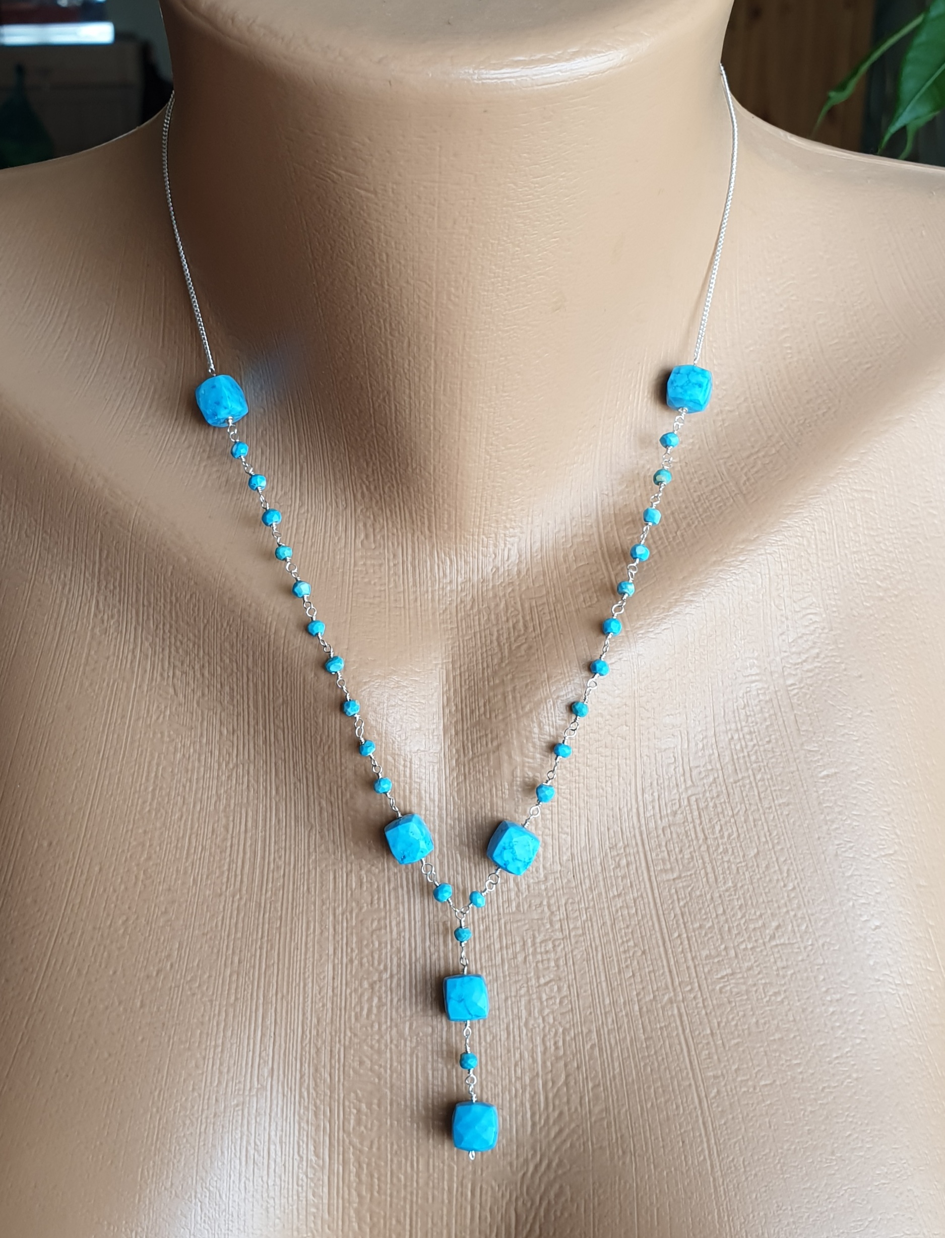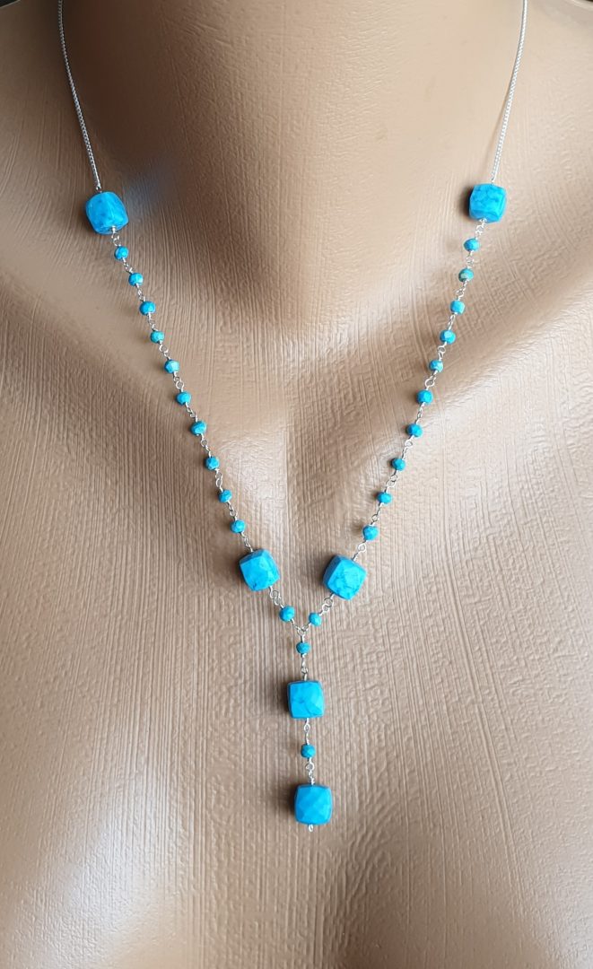 Colier unicat,lucrat integral manual, cu Turquoaz cuburi cu latura de 6 mm si margele de 2,5-3 mm. Pietrele sunt montate in lant de argint, cu fir de argint.