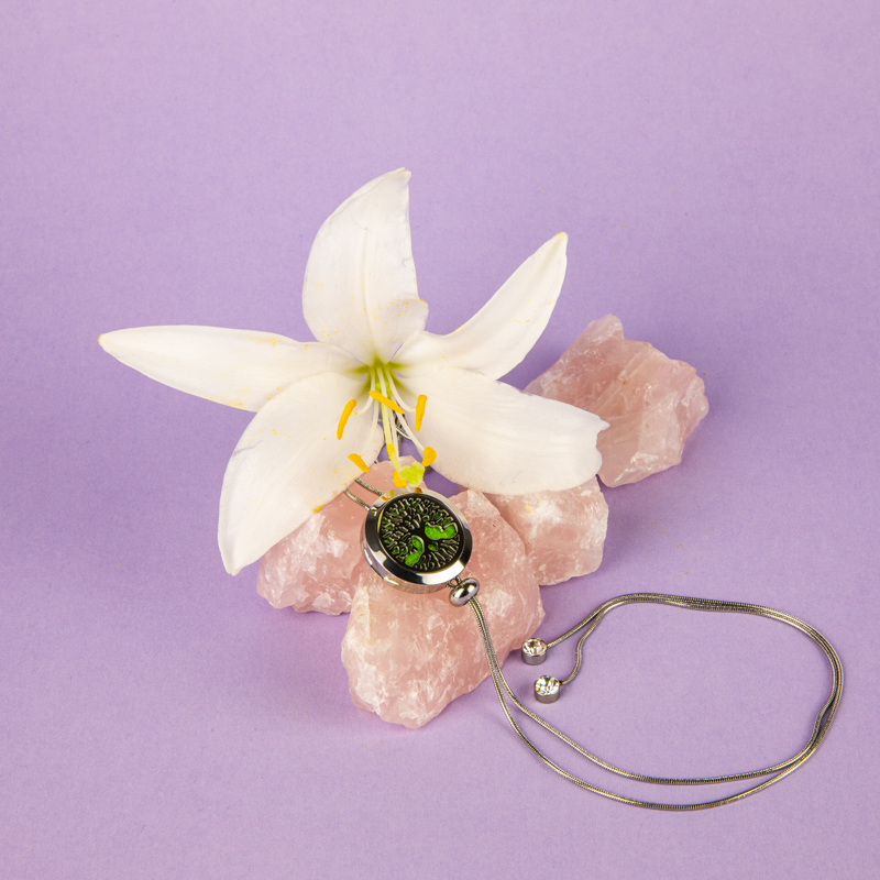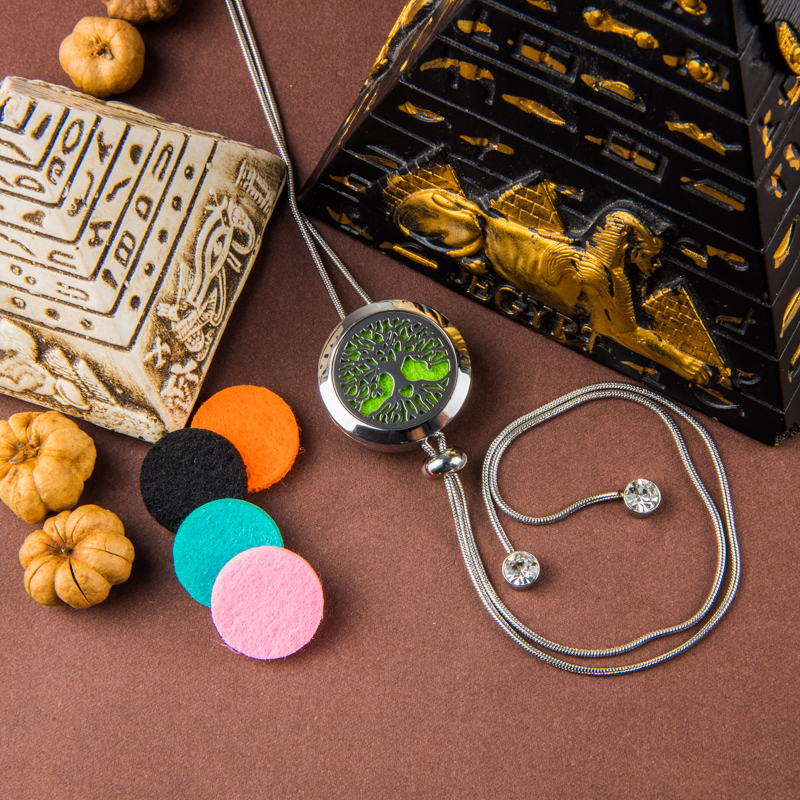 In interiorul medalionului Tree of Life, prevazut cu inchidere magnetica, se introduce unul din cele 8 paduri de fetru pe care se pune uleiul esential. Datorita culorilor variate ale acestor paduri, setul poate fi asortat usor la orice tinuta.