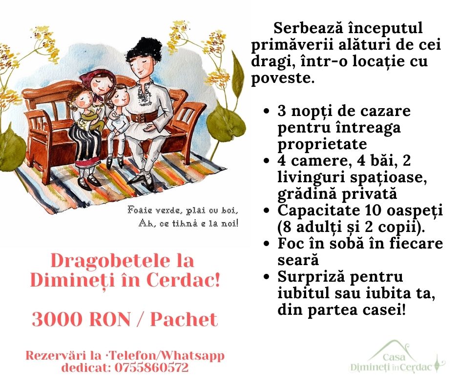 Casa Dimineți în Cerdac și-a deschis porțile de curând și vă așteaptă să vă bucurați câteva zile de căsuța lutuită cu grijă de altă dată și o grădină generoasă. Autenticul românesc, farmecul poveștilor din copilăria petrecută la bunici și o simbolistică aparte se regăsesc în fiecare colțișor din această locație gândită să poată primi grupuri de prieteni dar și familii cu copii năzdrăvani.