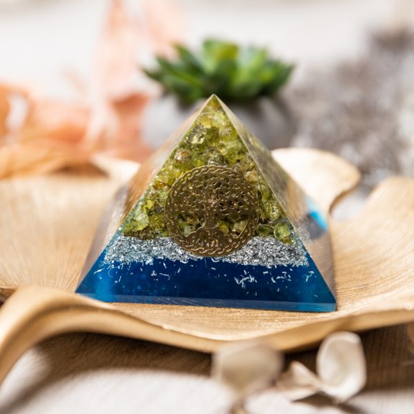 Piramida orgonica Debbie din cristale de Peridot cu simbol Copacul Vietii