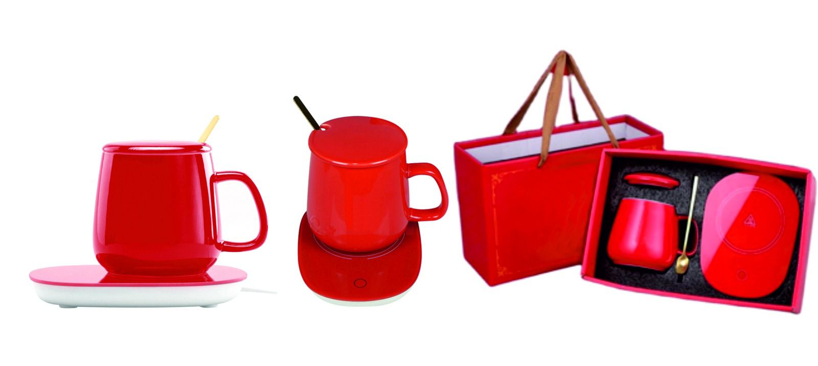 Set cadou format din sistem încălzitor, cană și capac din ceramică, lingurița metalică, intr-o cutie de prezentare, tip cadou.