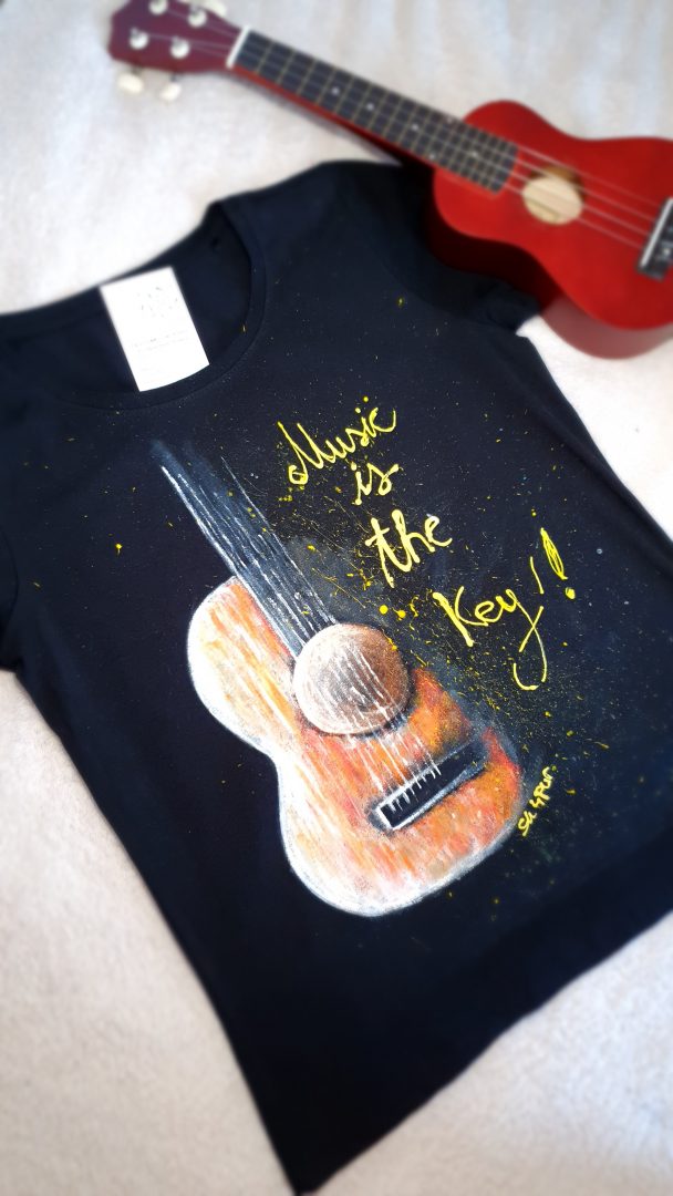 Tricoul pictat manual- “Music is the key – chitara” este o expresie a tot ceea ce muzica aduce în viața noastră.
