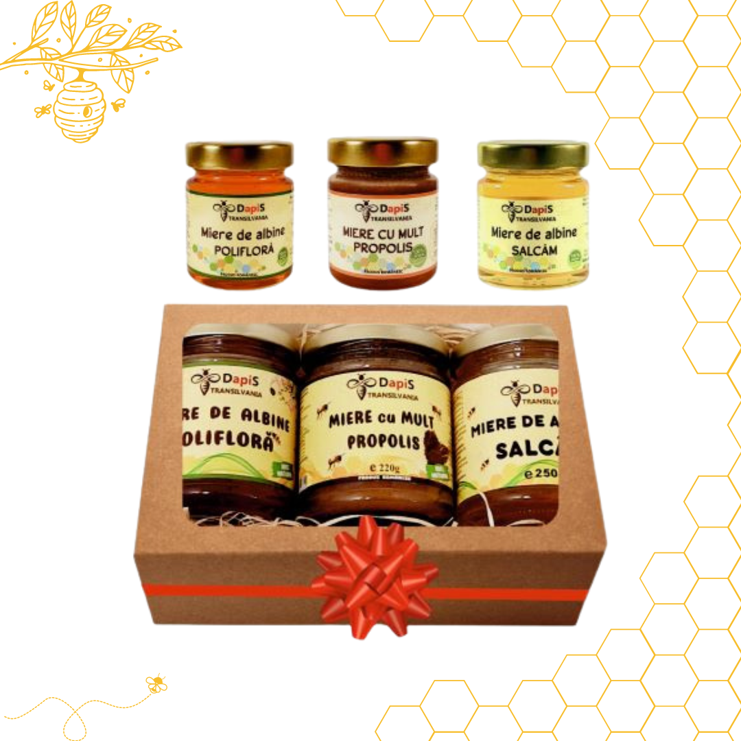 Pachetul contine 1 borcan cu mere de salcam 250 gr, mere cu mult propolis 220 gr si miere poliflora 250 gr