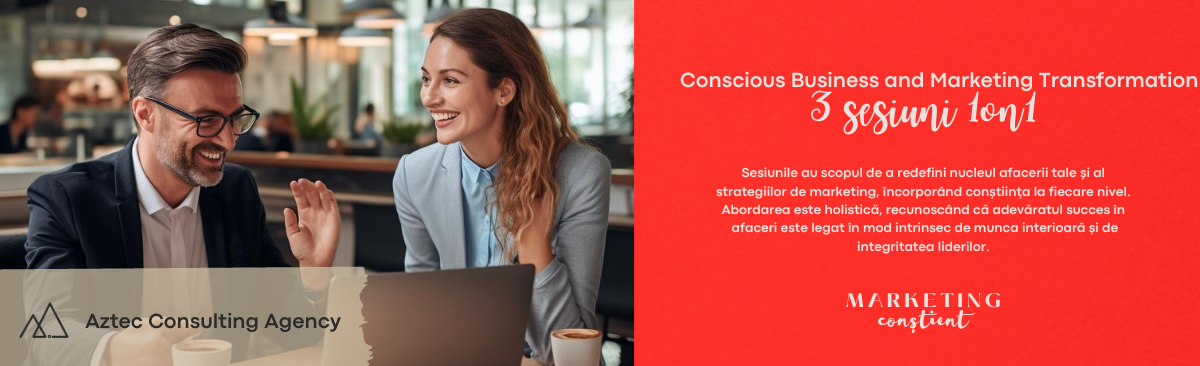 Sesiunile de consultanță și coaching Conscious Business and Marketing Transformation au scopul de a redefini nucleul afacerii tale și al strategiilor de marketing, încorporând conștiința la fiecare nivel. Abordarea este holistică, recunoscând că adevăratul succes în afaceri este legat în mod intrinsec de munca interioară și de integritatea liderilor. Vei avea parte de noi perspective pentru a-ți da boost afacerii prin practici etice, strategii de creștere durabilă și un angajament profund de a avea un impact pozitiv asupra societății și mediului.