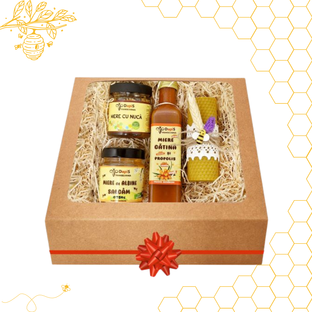 Daruieste un strop de sanatate. Pachetul cadou Silent contine 3 sortimente de miere si o lumanare naturala realizata din foita de ceara de albine.