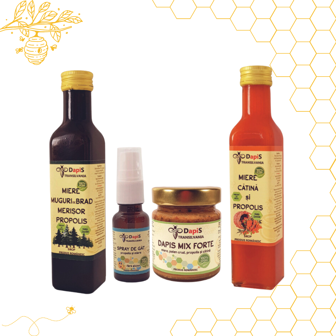 Mierea, polenul, propolisul, catina, merisoarele si mugurii de brad sunt produse care ne asigura o functionare optima a organismului. Pachetul de imunitate clasic contine Dapis mix forte 220 gr, Sirop de muguri de brad 250 ml, Sirop de catina 250 ml si Sprayul de gat