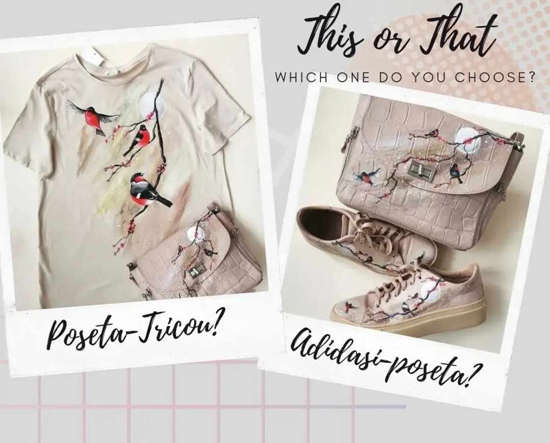 Personalizare prin pictură pe haine (tricouri, geci denim și piele, rochii, cămăși, treninguri etc), încălțăminte (sneakers piele, teniși textil) și accesorii (pălării, șepci, poșete, rucsacuri, portofele etc). Prețul diferă în funcție de complexitate, manopera este 75 lei pentru ora de lucru. Lucrez pe piesele vestimentare trimise de clienți.