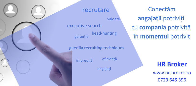 Echipa HR Broker are expertiză în recrutarea atât pentru posturi de entry level cât și pentru Middle și Top Management în majoritatea domeniilor de activitate. Dacă aveți nevoie să recrutați agenți de vânzări sau National Sales Manager, dacă doriți să găsiți cel mai loial Asistent Manager sau cel mai eficient Country Manager, este suficient să ne contactați și, împreună, vom identifica persoana ideală ptr organizația voastră.