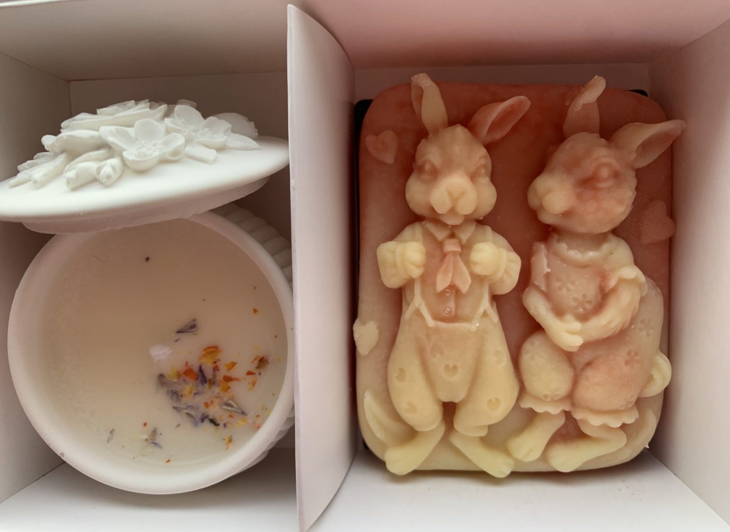 Un set cadou cu produse naturale handmade ce contine un sapun natural parfumat si o lumanare parfumata cu ulei esential de verbina exotica, din ceara de soia naturala, turnata in recipient realizat manual.