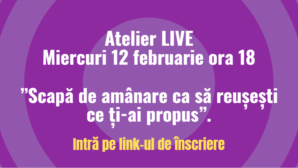 👉 Vino la Atelierul ”Scapă de amânare ca să reușești ce ți-ai propus”.